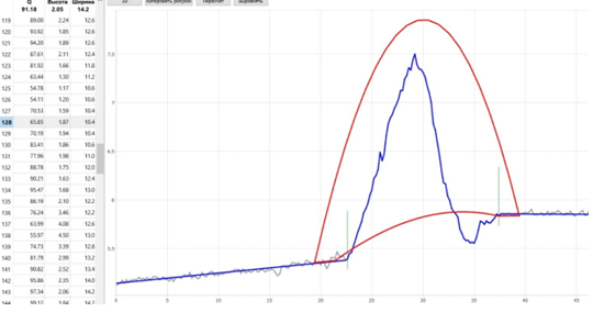 Для каждой вышеприведенной 3D реплики есть 256 2D реплик (сечений) сварного шва, на которых можно детально посмотреть все дефекты. В каждом сечении программа оценивает ИКС/Q и выдает измеренные значения высоты и ширины шва.