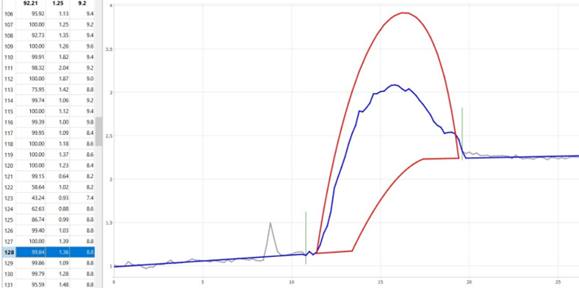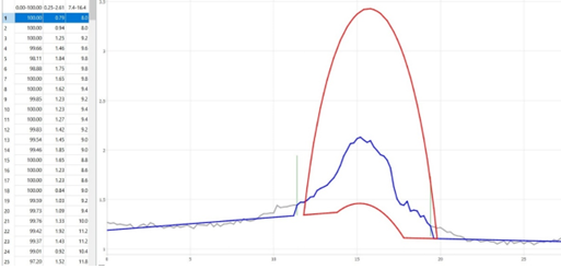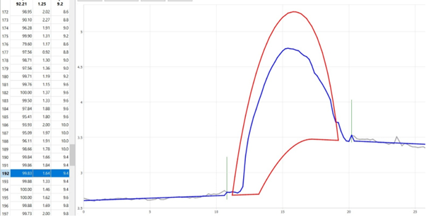• Анализ: Мы видим почти идеальное заполнение. Пик проплавления по-прежнему центрирован. В потолочном положении многие боятся «провала» корня, но здесь синяя кривая стабильно идет по верхней границе эталона.