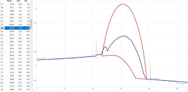 • Анализ: Кривая профиля абсолютно спокойная и симметричная. Это говорит о том, что сварщик не «выдохся» к концу стыка, его концентрация и контроль сварочной ванны на корневом шве остаются эталонными.